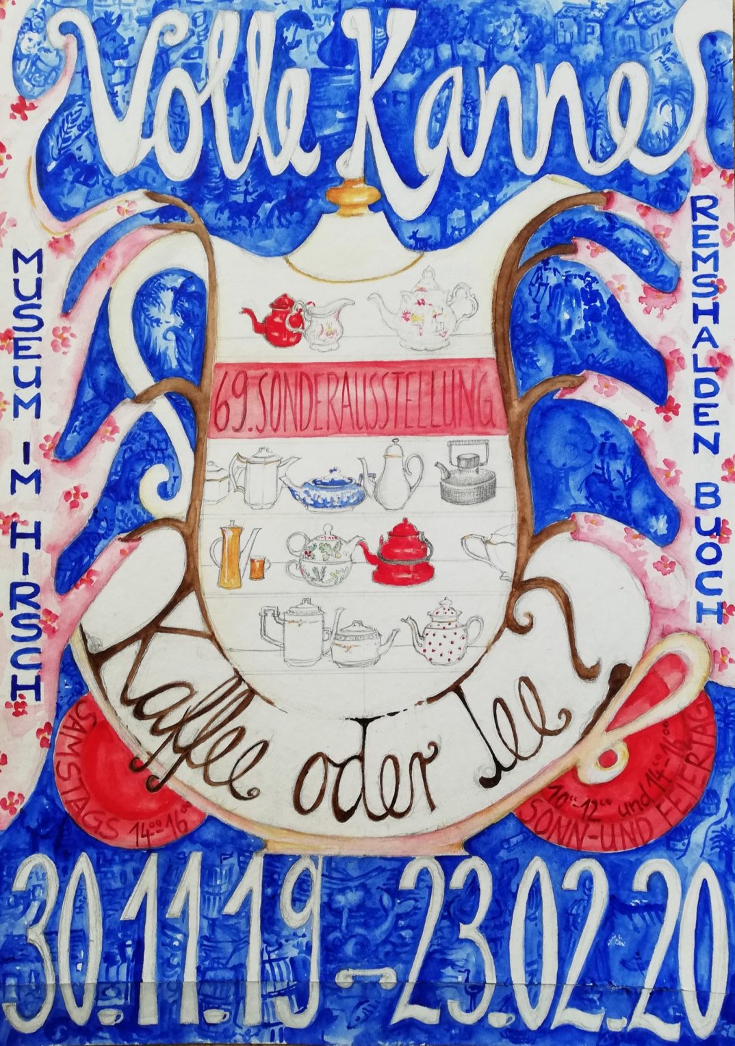 In seiner 69. Sonderausstellung widmet sich das Museum im Hirsch einem aus dem täglichen Leben fast verschwundenen Gegenstand. Die Kaffeepause, der Kaffeeklatsch, der Kaffee to go und die Tasse Tee gehören zu unserem Alltag. Weitgehend verschwunden – und durch die Thermoskanne ersetzt – ist jedoch die Kaffee- oder Teekanne. Sie standen früher im Blickpunkt der Kaffeetafel und der Tea-Time. Wir möchten mit unserer Ausstellung die Vielfalt der Formen, Farben und Muster zeigen. Es gibt sie in schlichtem weiß und mit Blümchen, schlank und dickbauchig, von klein bis groß, von kitschig bis edel, aus Porzellan, Email, Silber und Keramik.